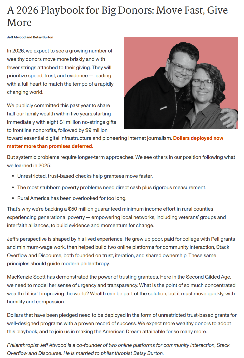 There are few issues more urgentâor more misunderstoodâthan poverty in America. And even fewer solutions as bold as simply giving people cash. Jeff Atwood, the tech entrepreneur behind Stack Overflow, and his partner Betsy Burton, a trained scientist with a deep commitment to equity, are working to change that. Together, theyâve launched a $50 million guaranteed minimum income initiative across some of the poorest rural counties in the countryâplaces that mirror their own family roots. In this episode, Jeff and Betsy share a story that is as personal as it is political. From the hills of West Virginia to their home in Alameda, California, they speak candidly about wealth, dignity, hope, and the American Dream. Weâll explore how their own childhoods and their children have shaped their philanthropy, how storytelling is challenging tired myths about the poor, and why 2025 is the moment to rewrite the social contract in America. This is not your typical conversation about povertyâand itâs not your typical couple trying to solve it. Here is Jeff Atwood and Betsy Burton on The Business of Giving